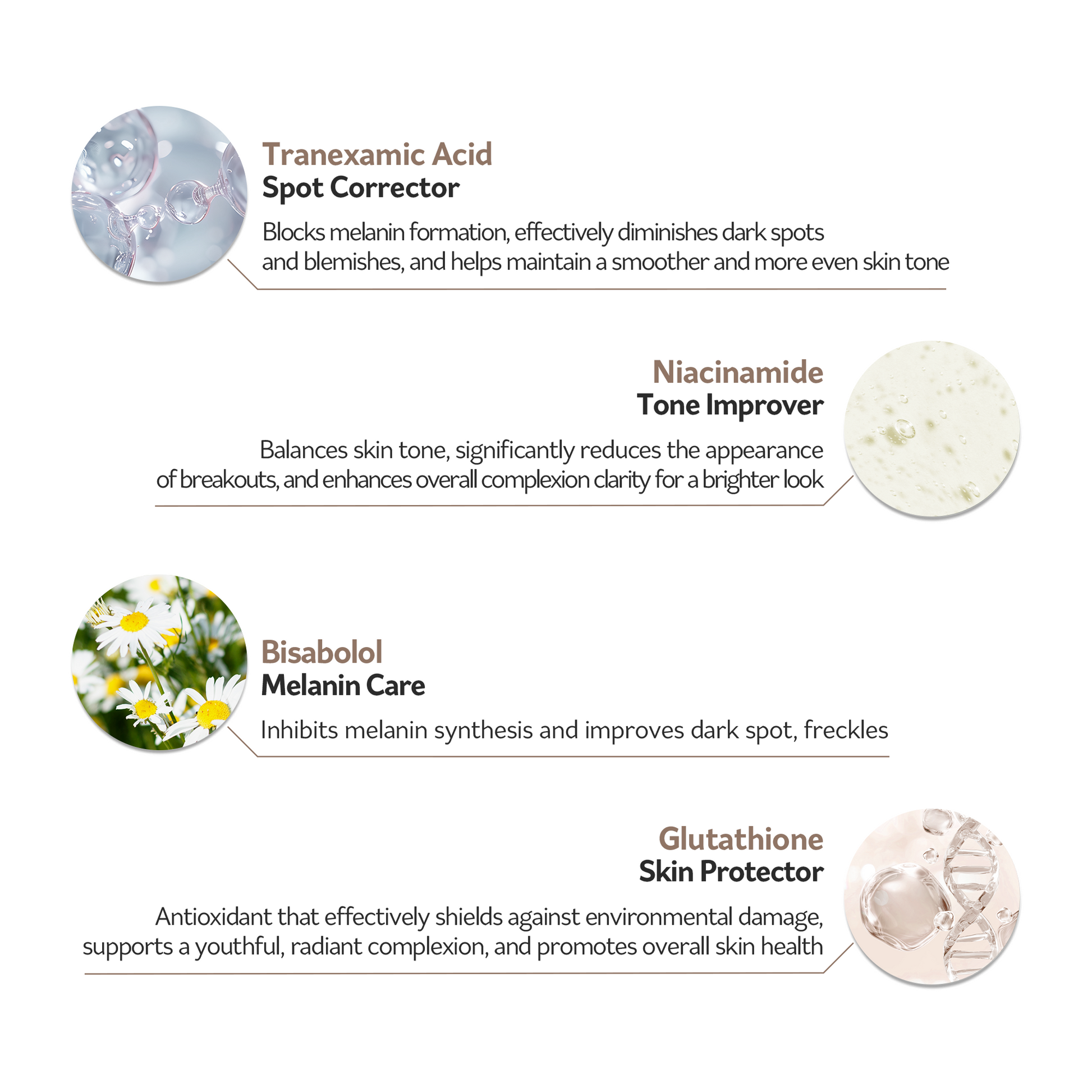 Interrupts Pigment Pathway: The core ingredient, TXA (Tranexamic Acid), is an effective agent that works to visibly fade persistent dark spots, post-acne marks, and melasma