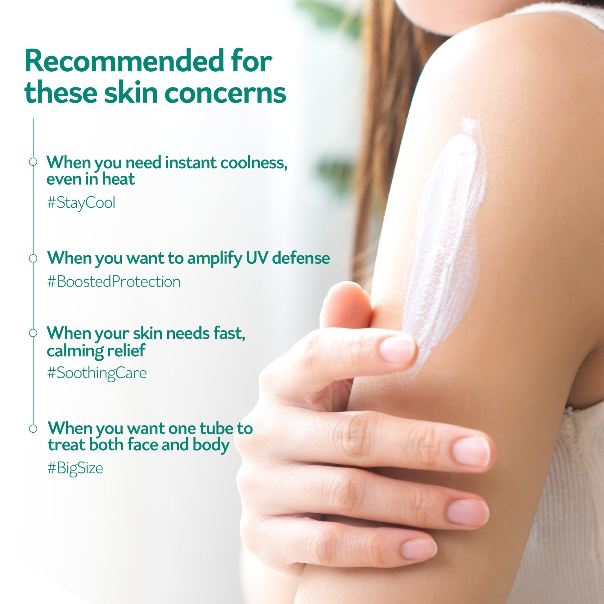 Cooling Complex: It includes a Cooling Complex (Menthol/Mint Derivatives) that instantly soothes skin and reduces temperature upon application, making it a relief on a hot day or after sun exposure