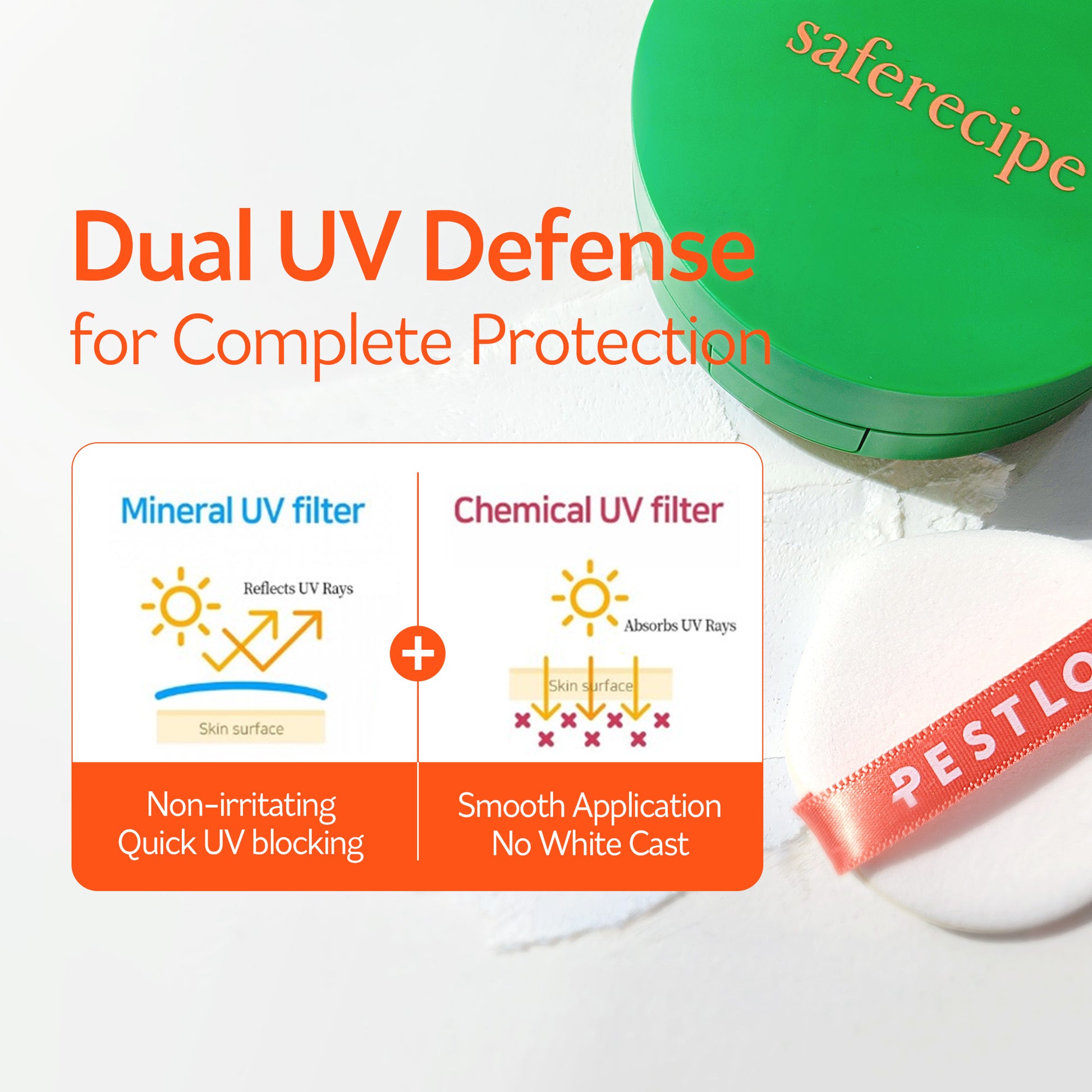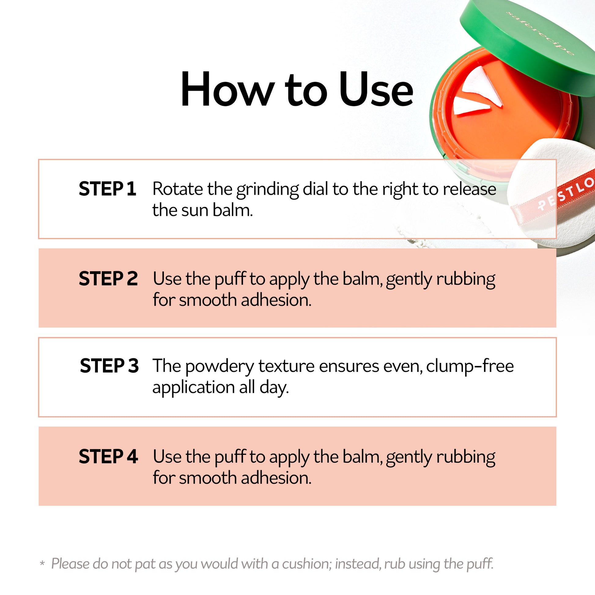 Grinding Technology: The compact is designed to grind fresh sunscreen onto a puff with every use, ensuring a clean, hygienic, and perfectly dosed application every time