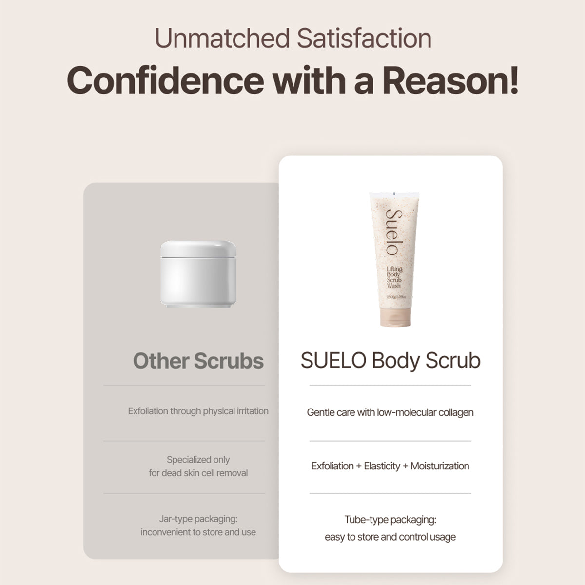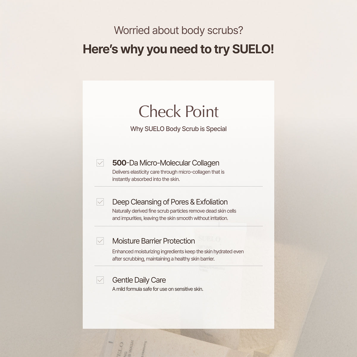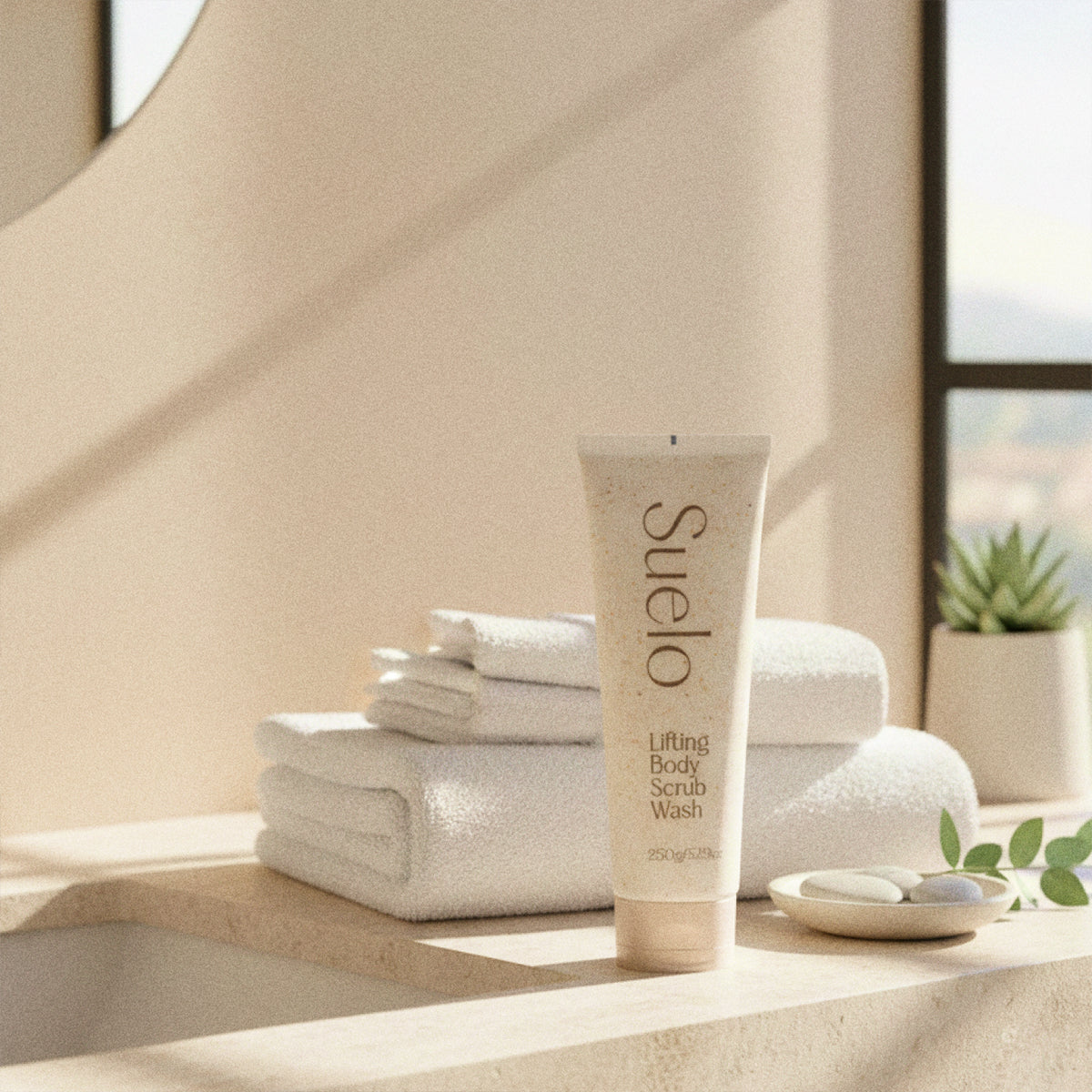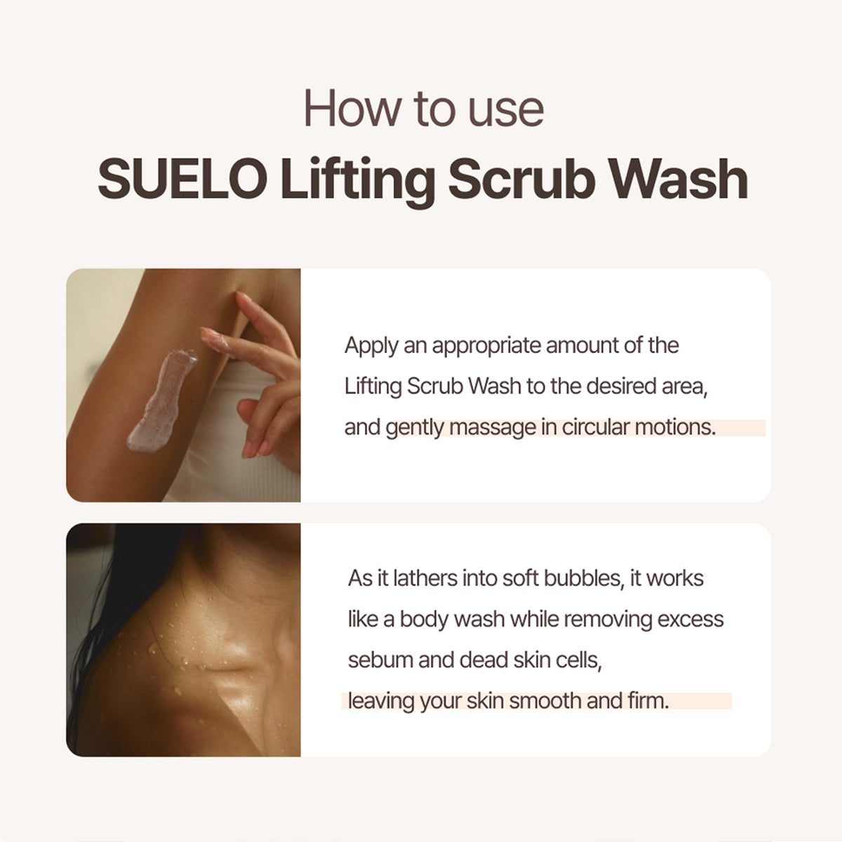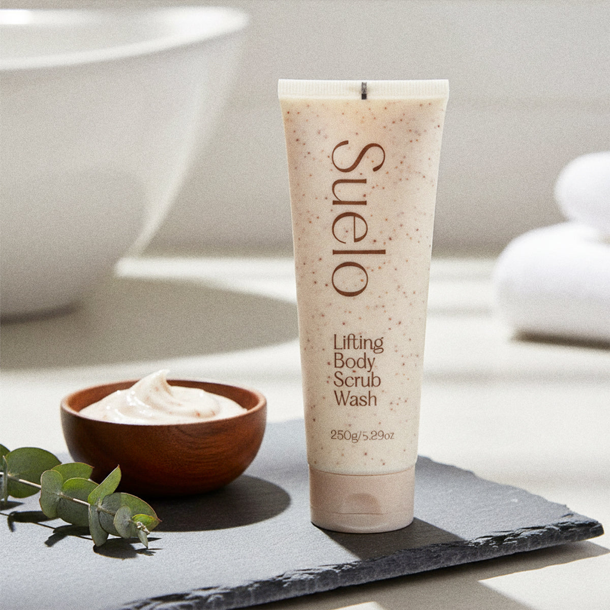 An all-in-one cream-type scrub that combines lifting, washing, and exfoliation in a single step with low-molecular-weight collagen and plant-derived ingredients. Elevate your shower routine to a professional body spa treatment with the SUELO Low Molecular Collagen Lifting Body Scrub Wash. This innovative formula is a powerful 3-in-1 solution, combining the benefits of a body scrub, a body wash, and a body pack in one easy step.
