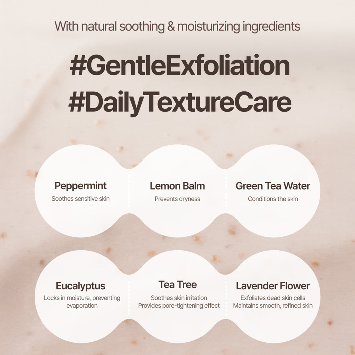 Refined Texture: Natural physical exfoliants, including Walnut Shell Powder and Tapioca/Mineral Scrub, gently and effectively buff away dead skin cells to refine texture. Clinical tests show a significant increase in dead skin cell removal after just one use