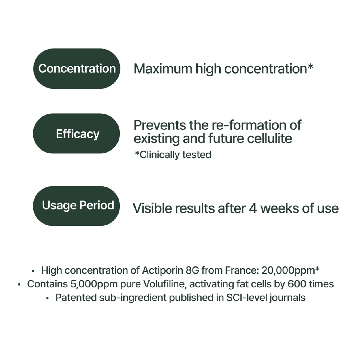 Cellulite and Roughness Reduction: Contains Actiporin 8G 20,000 ppm and a powerful Natural Lecithin PPC Complex that is clinically shown to suppress cellulite regeneration and significantly reduce skin roughness caused by cellulite after 8 weeks of consistent use